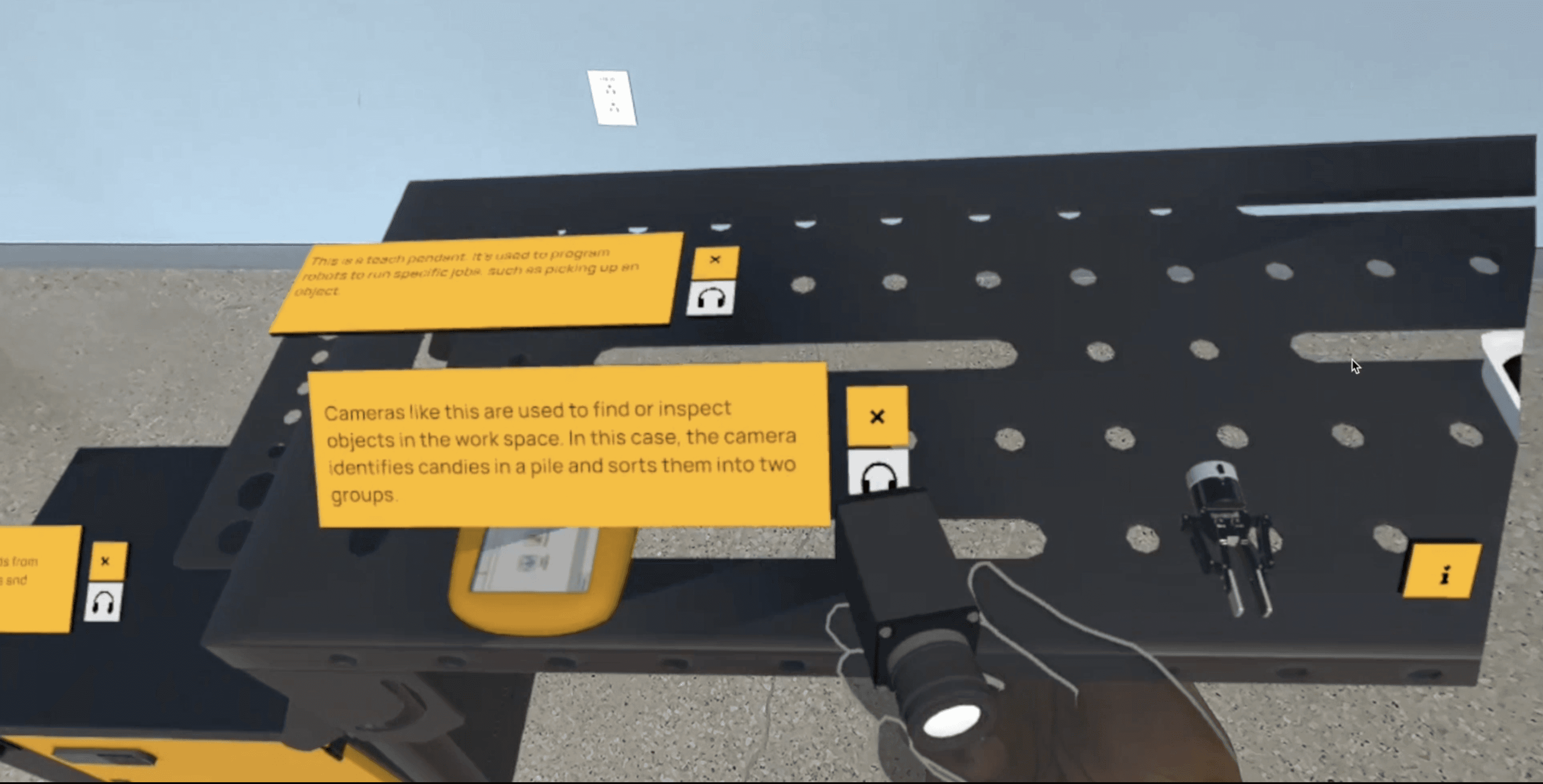 The Mixed Reality robot-annotation application shows a virtual robot workcell in Mixed Reality. The users can pick up and read (or listen!) about different components of the workcell like the teach pendant, the camera and the gripper. The application also has an "admin" mode where the ARM institute employees can pick a spot to place the robot so that they can arrange their physical exhibit around the virtual workcell.